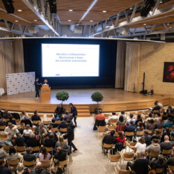 Bild einer Bühne mit Moderatorin und einem Publikumg, sitzend.